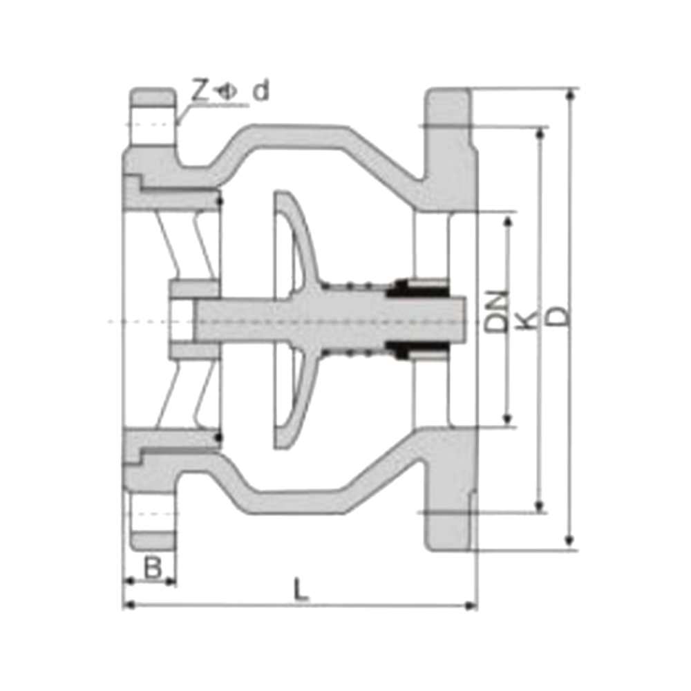 Disk ventila je vođen središnjom osi na oba kraja ulaza i izlaza, fleksibilno se otvara i zatvara, a može se postaviti vodoravno ili okomito. Disk ventila je opterećen oprugom, a njegovo brzo zatvaranje može učinkovito smanjiti pritisak vodenog čekića, uz dobre performanse brtvljenja i bez buke pri zatvaranju. Otporan na habanje i dug radni vijek.